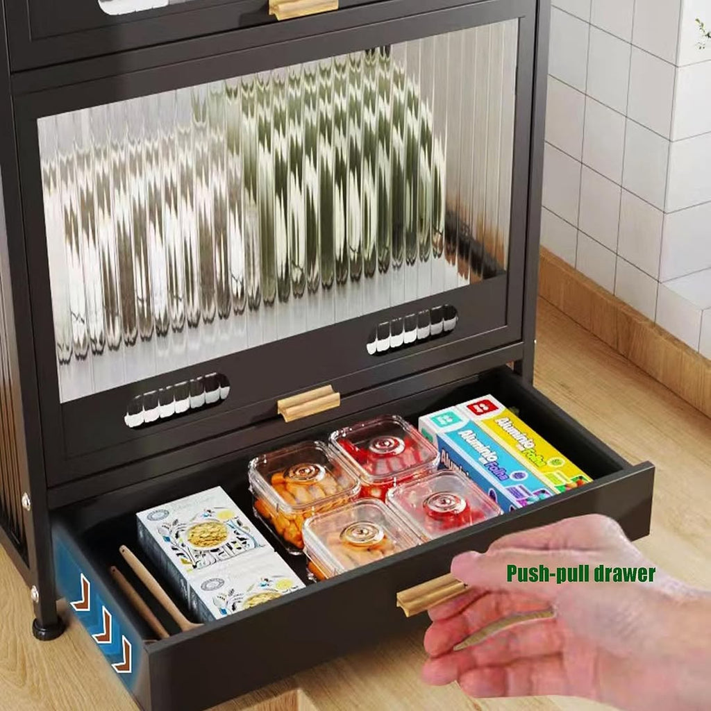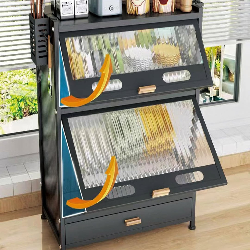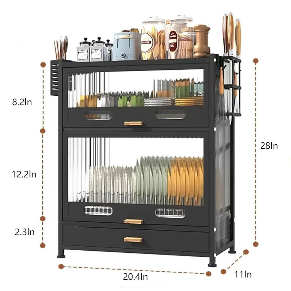 تصميم متين: مصنوع من معدن أسود مع أبواب زجاجية مزخرفة ومُضلّعة، هذه الوحدة متينة وجذابة. تفتح الأبواب للأعلى لسهولة الوصول إلى أطباقك.