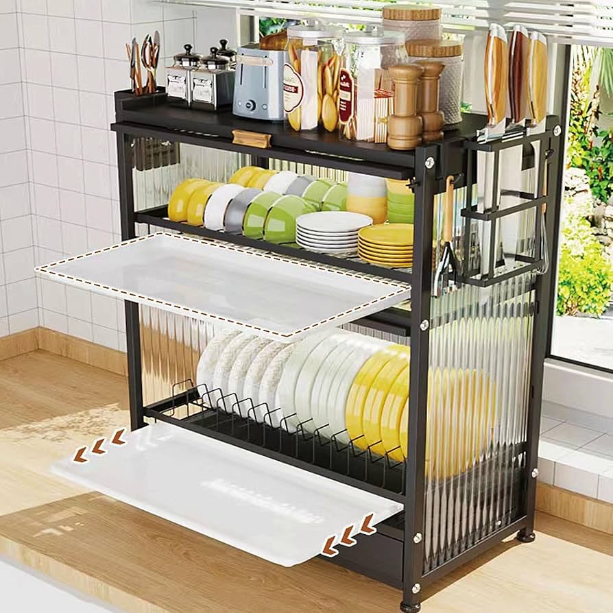 حاملات الأطباق والأوعية المدمجة: تم تصميم الأرفف الرئيسية خصيصًا مع رفوف لحمل الأطباق والأوعية بشكل مستقيم وآمن، مما يسمح لها بالجفاف في الهواء بعد الغسيل والحفاظ عليها منظمة بشكل أنيق.
