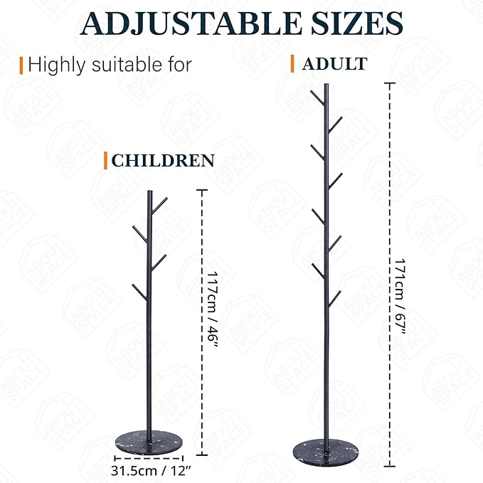 【MULTIPURPOSE HOOKS】: Designed with sturdy and staggered hooks, this freestanding coat tree offers ample space to hang multiple items, like clothes, handbags, hat, scarf, tie, umbrella, etc. And each hook can withstand up to 7 lbs without breaking.
